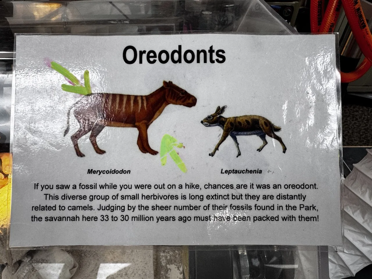 About 33 to 30 million years ago, after the ocean receded, the remaining savannah was inhabited by small herbivores called oreodonts. New species of oreodonts are still being discovered in the park—one as recently as 2016 by a visitor. Based on how many fossils have been found, the theory is that this area must have been packed with them.