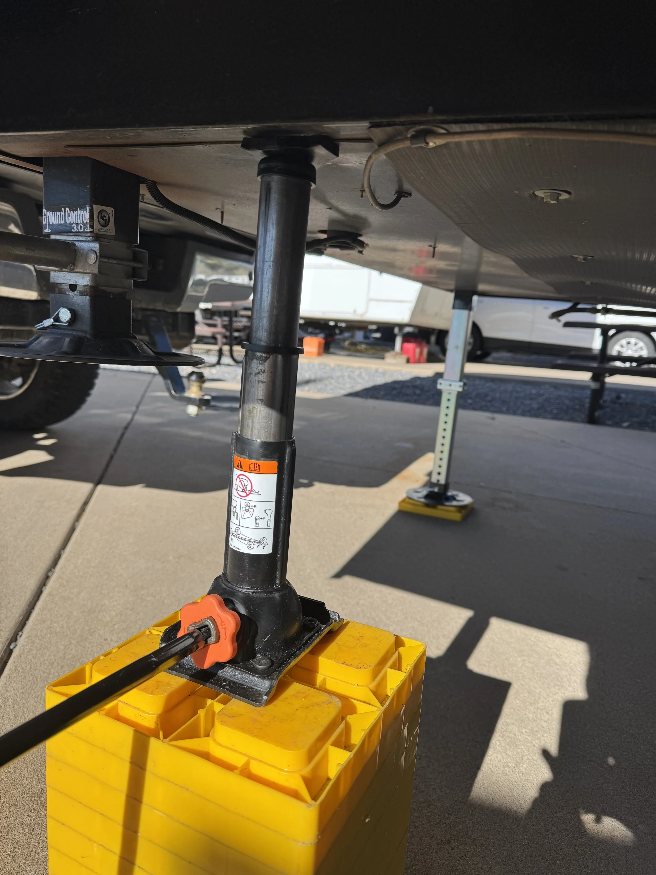 Auto-leveling is amazing—when it works. When we arrived at our 34th stop just north of Vancouver, Washington, we did our usual set-up routine, but when I hit the Auto Level button, we were greeted with our first auto-leveling error message. Something was wrong with the front right jack.