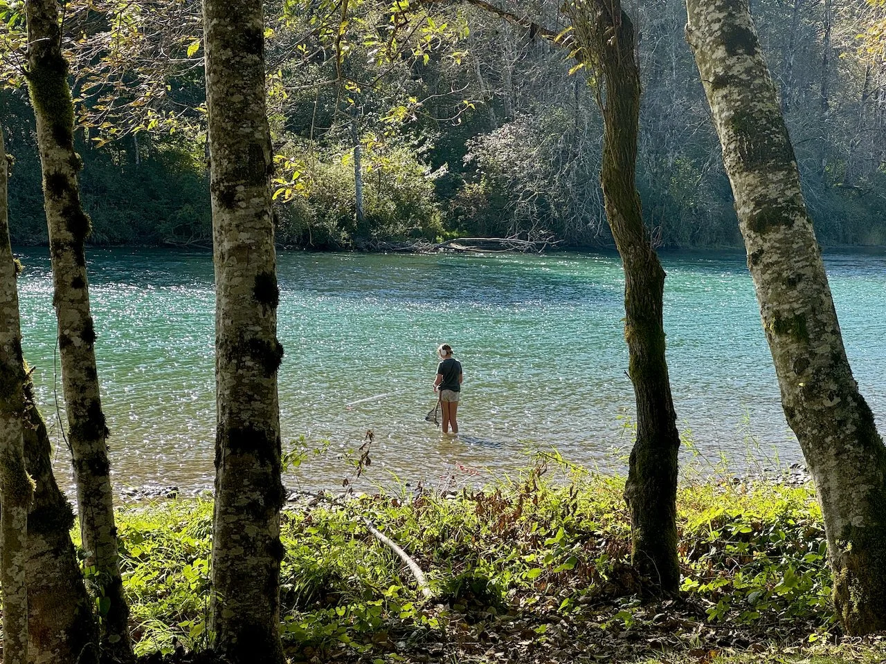 Sadie listening to an audiobook and fishing for salmon in the Skagit River