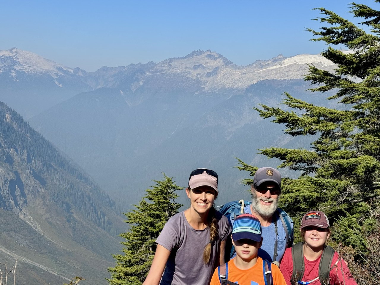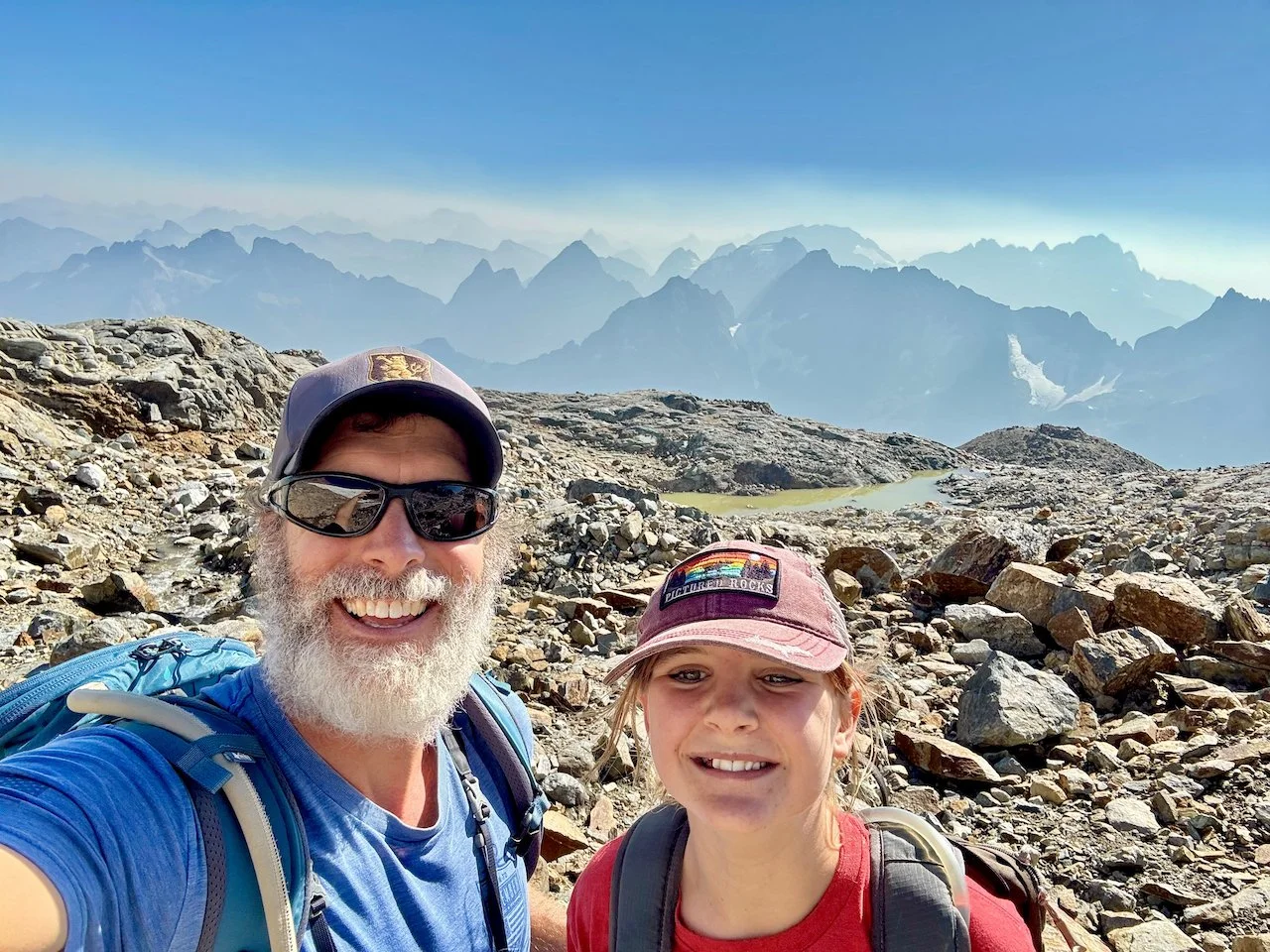 We continued up a side trail with the goal to reach the Sahale Glacier. At 5 miles and 4,000’ of elevation gain from the parking lot, we stopped to have lunch and watch a large marmot pop in and out of its den. Nate decided five miles was far enough, so he and Peyton began slowly descending the mountain and picking wild blueberries with the plan to meet back at the pass.