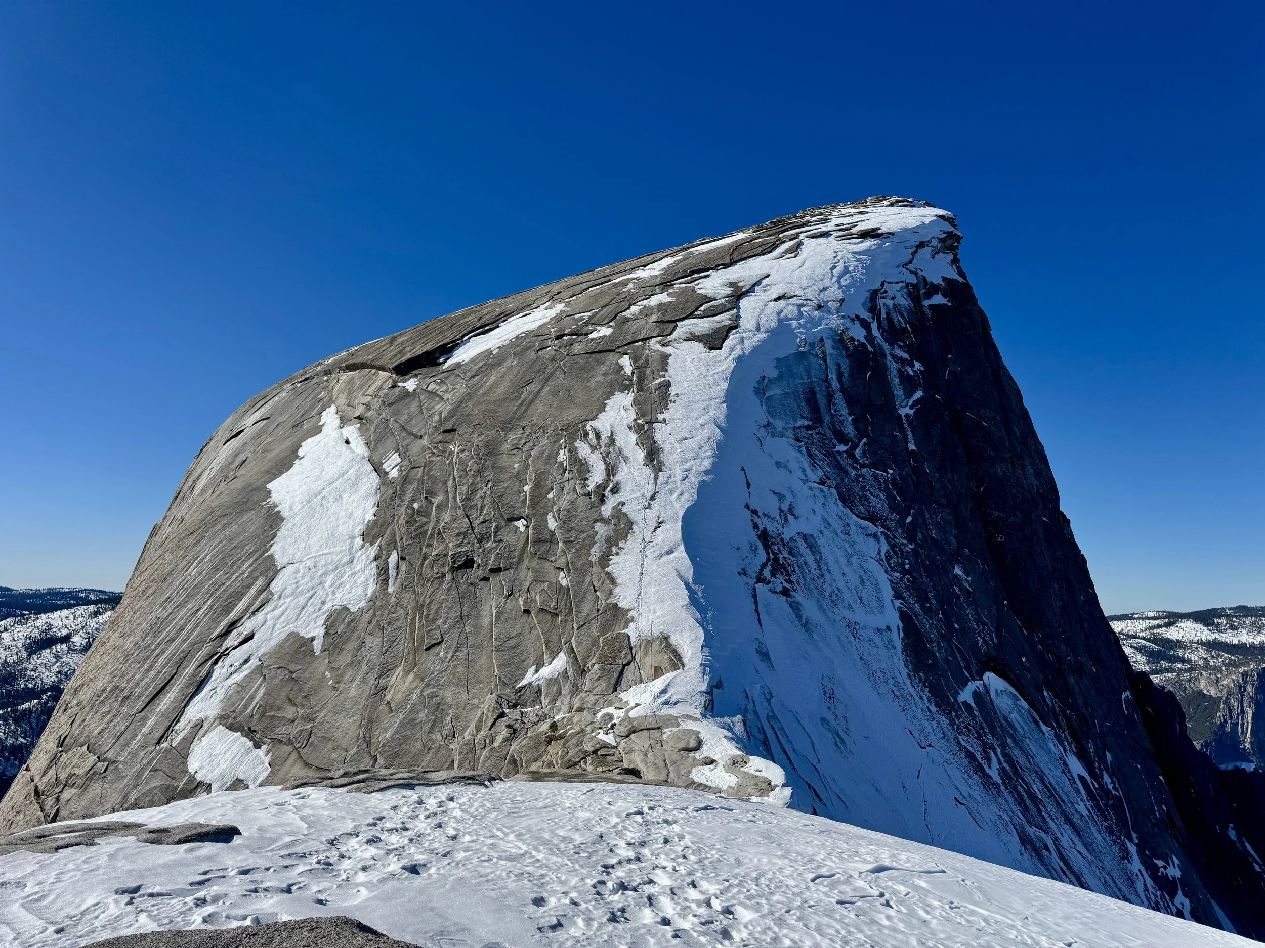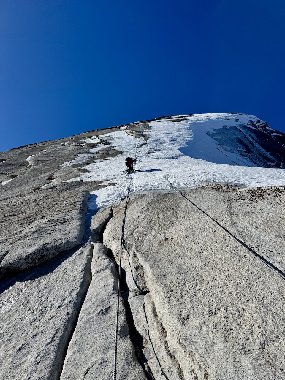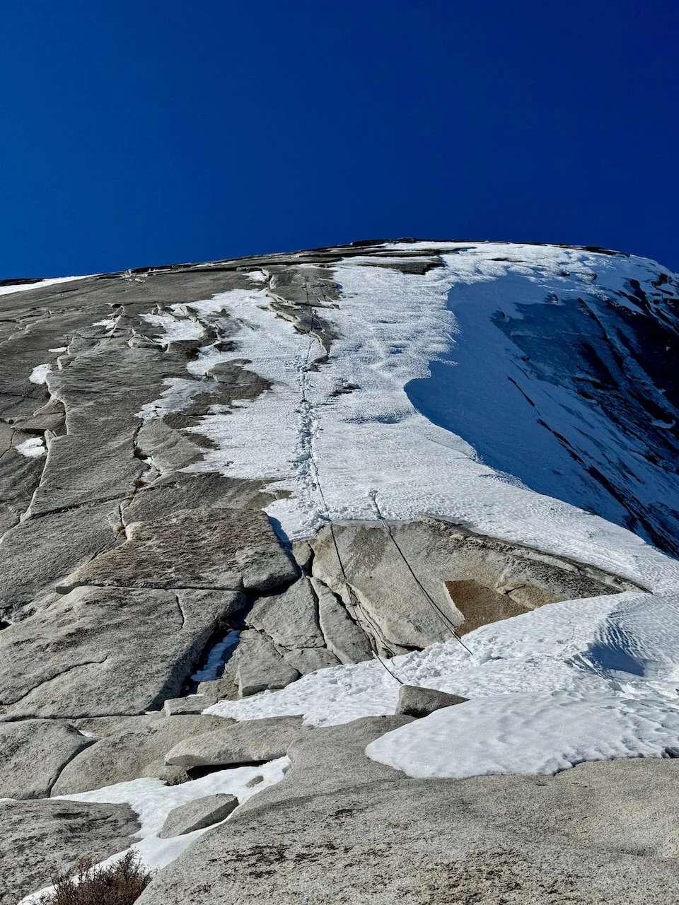 Nick Here: On the evening of January 14th, I began researching if it was safe and feasible to climb Half Dome in winter. I had always heard that the cables that are necessary to safely climb the last 400’ of 45 degree granite slab were “down” in winter. I thought that “down” meant that the cables were taken down, but no, they are just laying down on the rock with the support poles and wooden planks removed.