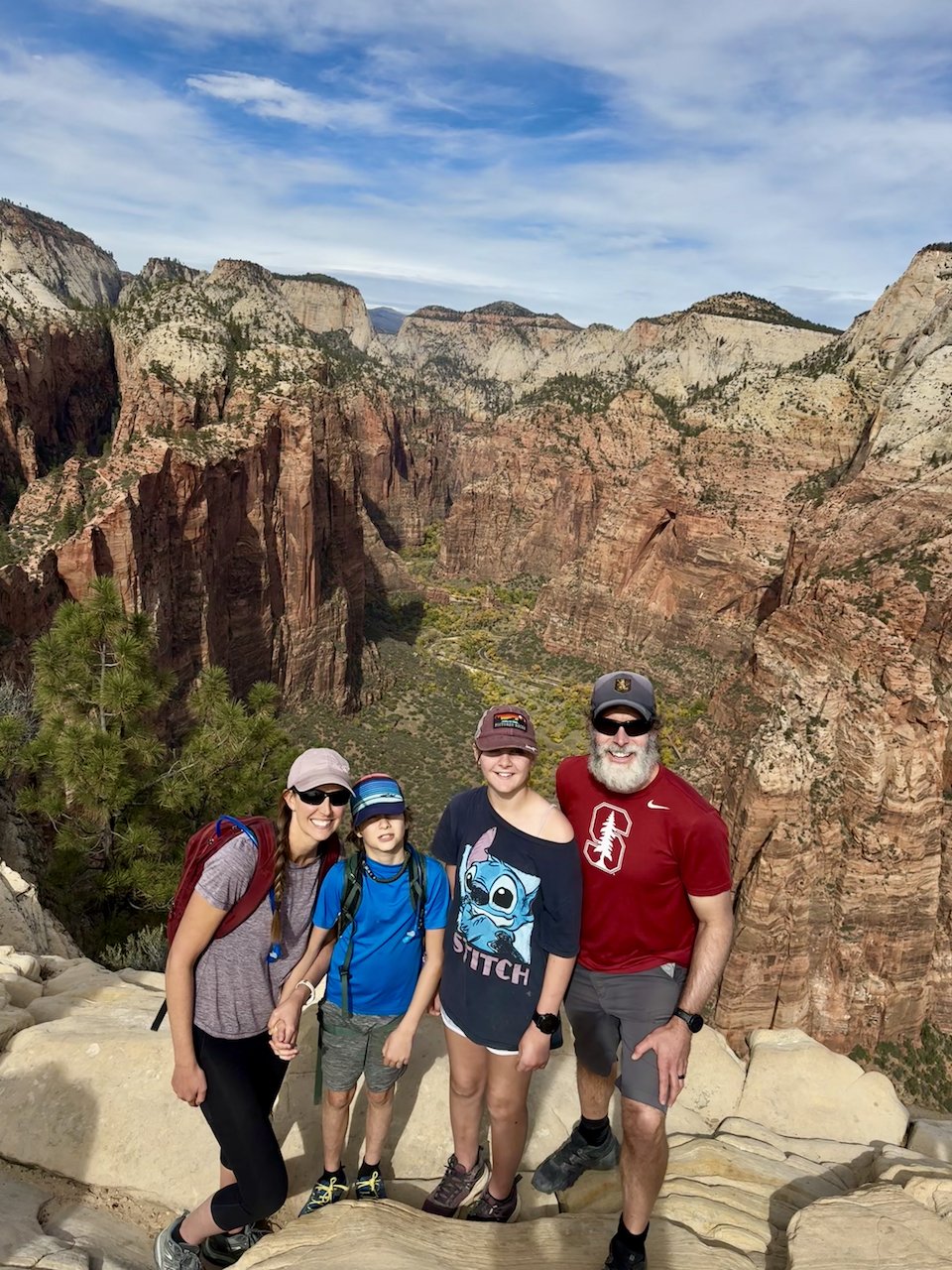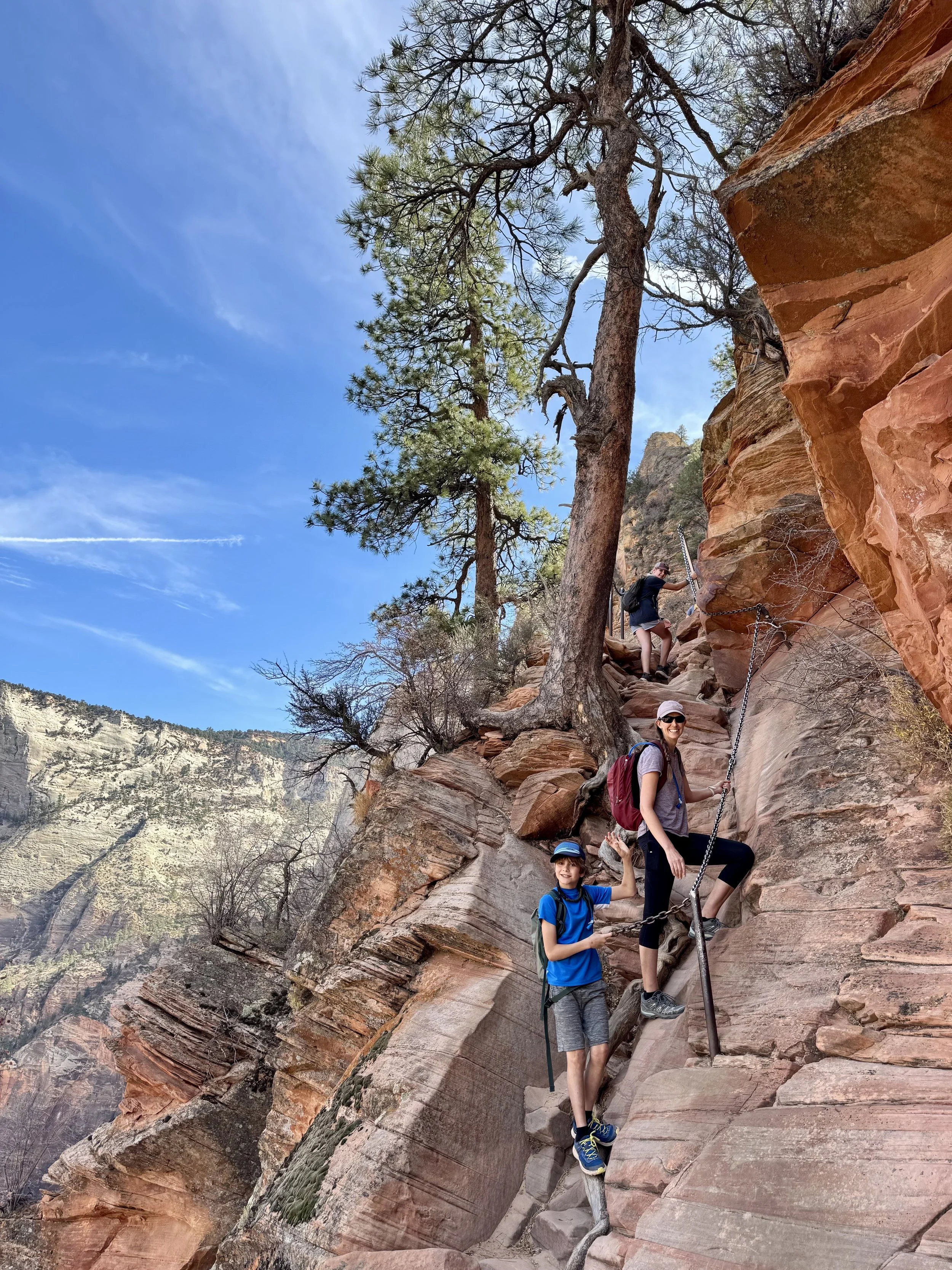 The final half-mile is the most famous: a narrow sandstone spine with sheer drop-offs on both sides, where anchored safety chains lead to the summit. The fearless kids thought the hike was exciting and bounded passed many adults white-knuckling the chains. This included their mother, who I don’t recall being at all nervous when we did the hike pre-kids in 2009. Something about a 9-year old boy holding the chain with one finger, leaning back, and dramatically singing “goodbye life” over and over...