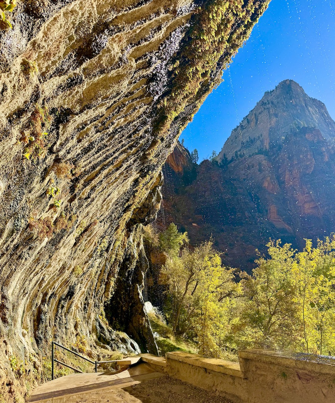 The next day we did some shorter hikes to Emerald Pools and Weeping Rock — an undercut rock alcove with water seeping out of the wall that nourishes lush hanging gardens. It is a gorgeous sight, but the thing that makes it truly incredible is that the water weeping today was rain 1,000 years ago! It fell on the plateau above, was absorbed by the ground, and then seeped through thousands of feet of porous Navajo Sandstone, hitting an impermeable layer of much denser siltstone and mudstone known as the Kayenta Formation. After all that seeping, the water drips out at the Weeping Rock as a year-round spring.