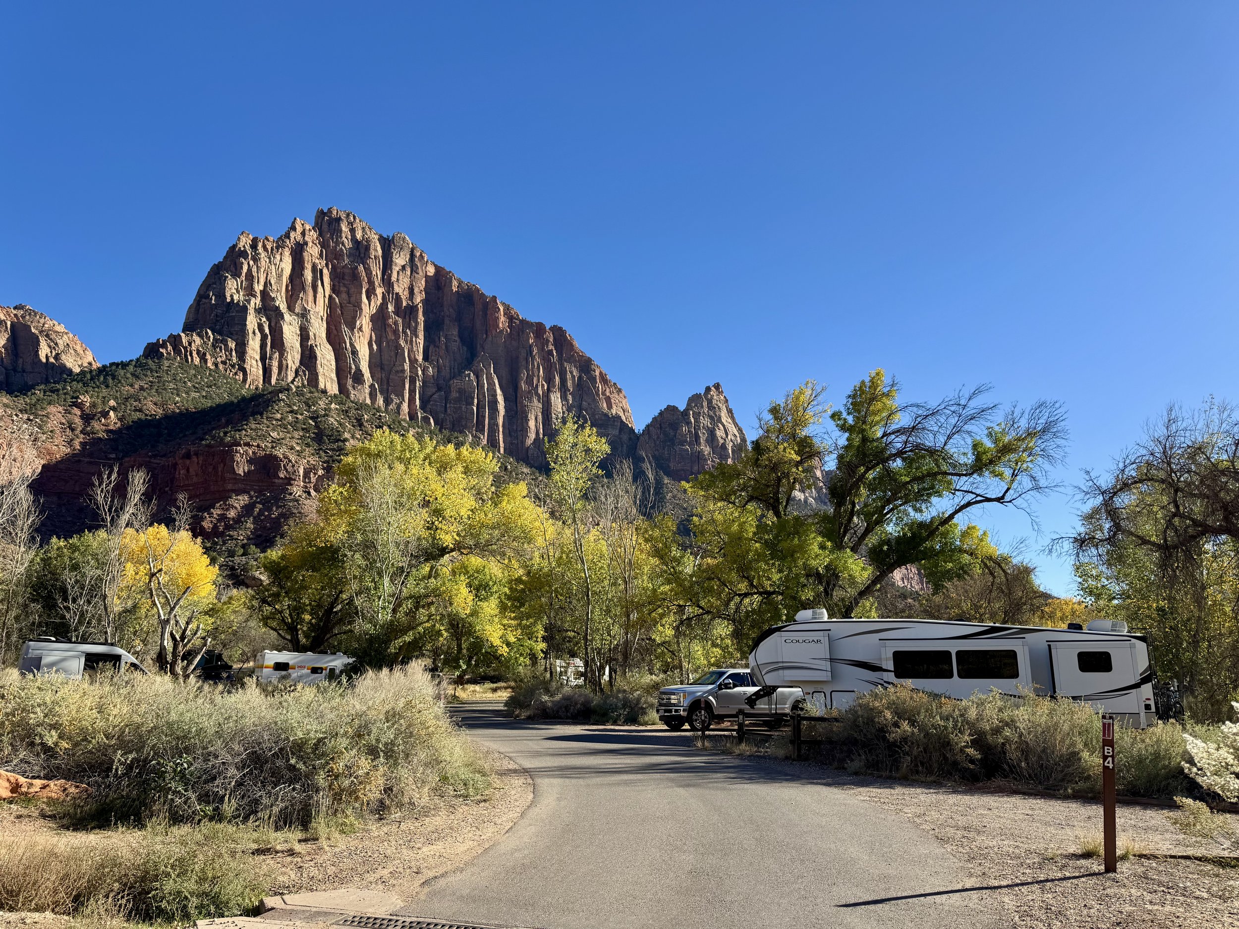 As a bonus, the campground is less than a half-mile walk to the visitor center and pickup point for the shuttle bus that accesses the Virgin River valley and park’s main attractions. That road is closed to private vehicles and the shuttle bus and biking are the only way to access the area. All that to say, after 15,000 miles of driving since the journey started, I was thrilled not to drive the truck for four days!